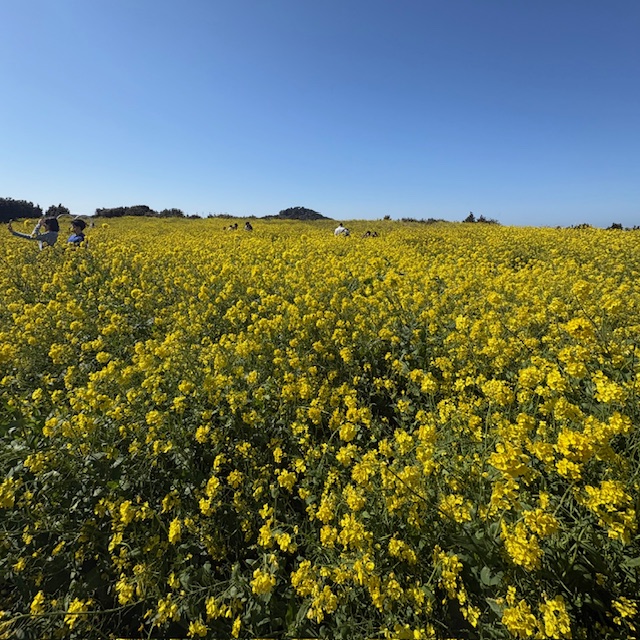 城山日出峰から歩いて15分くらいの海沿いに菜の花畑があり